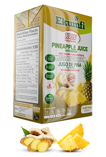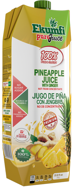 100% Natural Pasteurized Pineapple Juice with Ginger made from non-GMO fruits, NO additives, NO preservatives, NO added sugar, NO artificial sweeteners, NO flavoring or coloring.