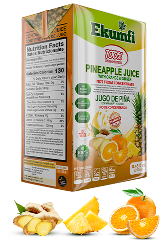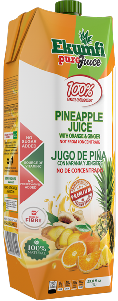 100% Natural Pasteurized Pineapple Juice with Orange and Ginger made from non-GMO fruits, NO additives, NO preservatives, NO added sugar, NO artificial sweeteners NO flavoring or coloring.