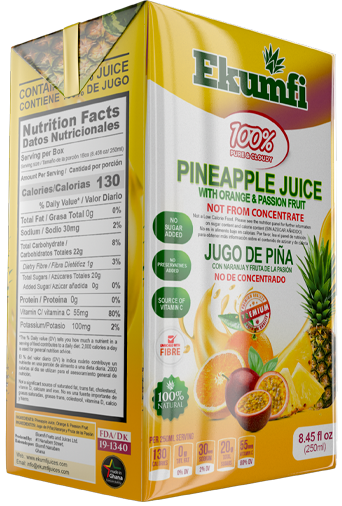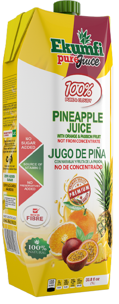 100% Natural Pasteurized Pineapple Juice with Orange and Passion Fruit made from non-GMO fruits, NO additives, NO preservatives, NO added sugar , NO artificial sweeteners NO flavoring or coloring.